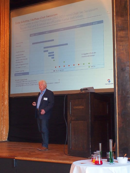 Die Experience-Manager Rolf Neukom & Ruedi Erismann teilten anschließend in ihrem Vortrag “Digital Engagement bei der Swisscom” ihre Erfahrungen aus drei Jahren mit Web-Chat mit Privatkunden und sechs Monaten im Geschäftsbereich KMU. Dabei setzt Swisscom den Liveperson-Chat sowohl reaktiv als auch durch Geschäftsregeln getriggert proaktiv ein. Das geschieht auf den Produktseiten (52 Prozent Anteil), im Kundencenter-Selfservice und der dazu gehörigen App (56 Prozent Anteil).