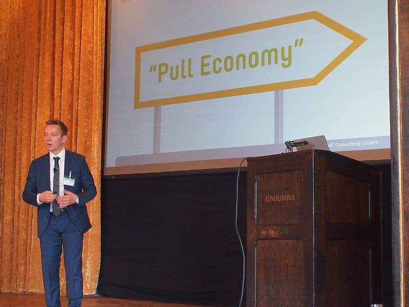 In 2020 werde es dreimal soviel “Connected Things” wie Menschen geben – gegenwärtig seien wir noch leicht in der Überzahl. Das werde was ändern setzte Grünzner fort, und die Effekte der sogenannten “Pull Economy“, die ihre Kraft aus der Vernetzung von Ressourcen bezieht, seien schon heute spürbar. Amazon Echo oder deren Dash-Button seien oft genannte aber wichtige Beispiele. Doch wie damit umgehen, als Unternehmen?