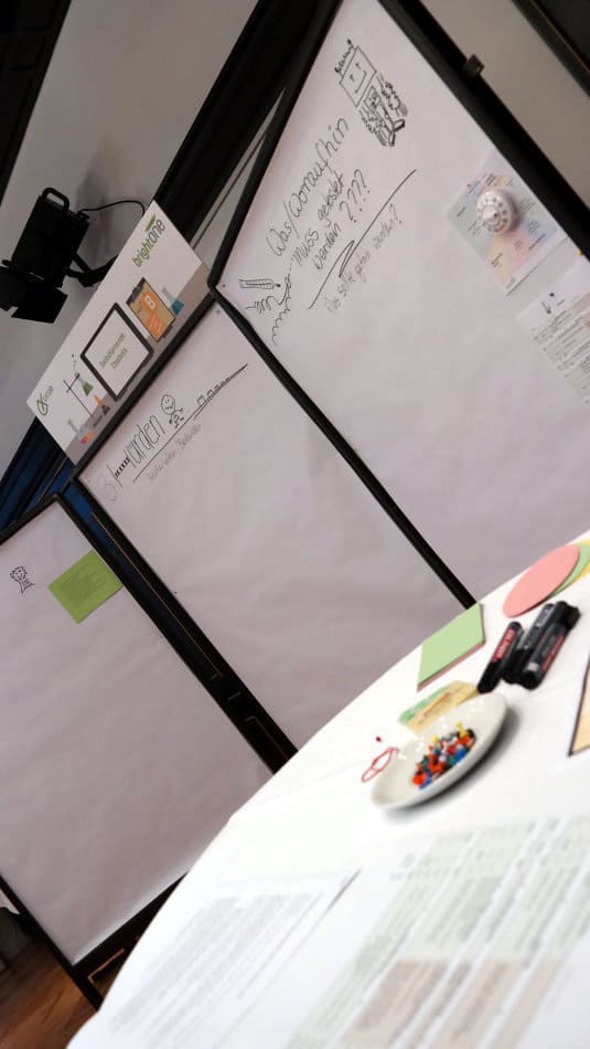 Nach der Mittagspause wurde es interaktiv. Die Teilnehmer bekamen die Gelegenheit, sich mit den Werkzeugen unseres CX co:lab vertraut zu machen. Sie wurden in die Situation der fiktiven Firma Moriat Garments AG versetzt. Mit Methoden des CX co:lab haben wir gemeinsam bewertet, welche Chancen und Risiken mit der Einführung von neuen Technologien verbunden sind. Das erfolgte in drei Schritten